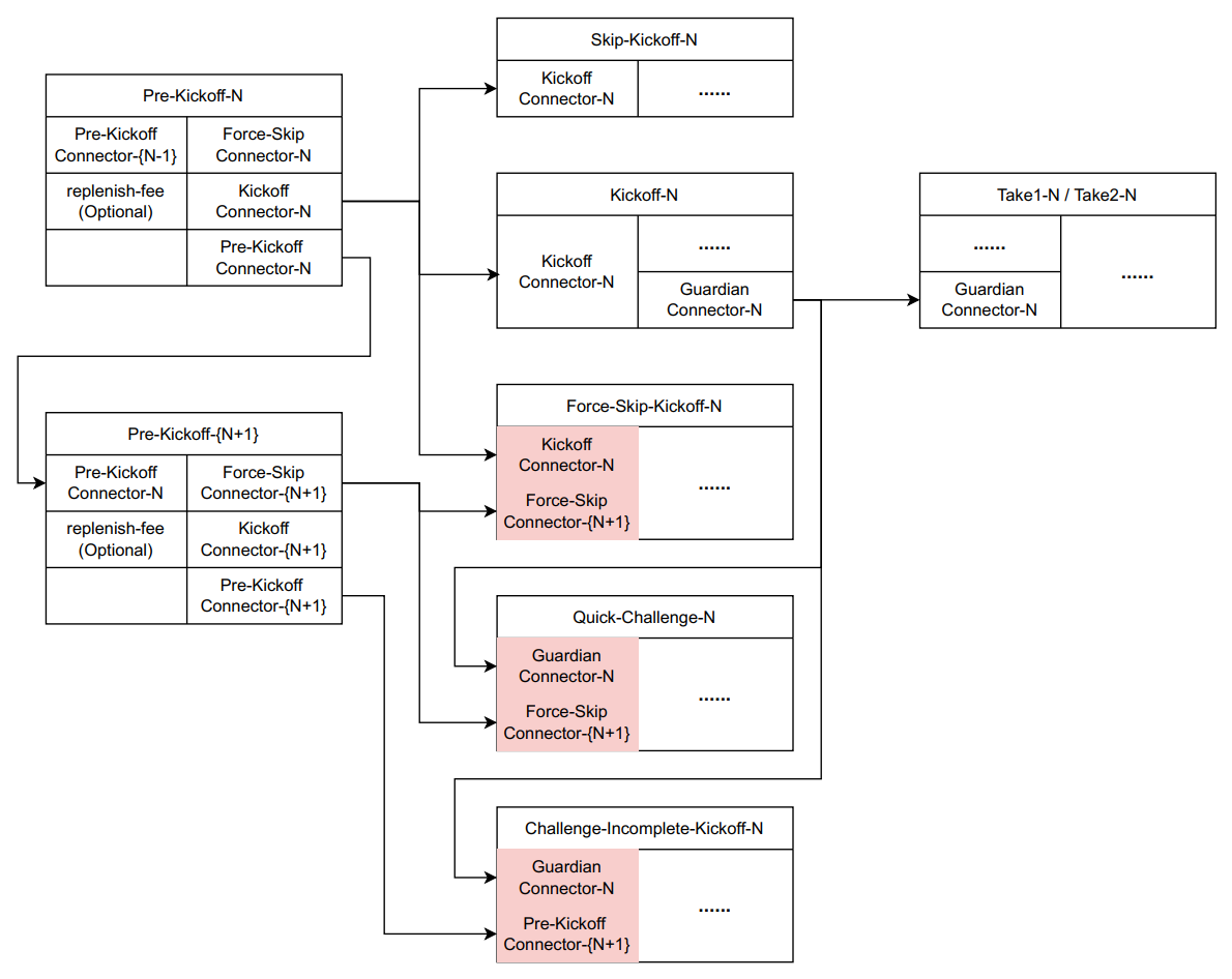 Peg-out requests sequentially. As outlined in Fig. 4, For operator, 1) if the Operator completes reimbursement in Graph-N, or actively skips it, they can directly enter the next Graph (i.e., broadcast Pre-Kickoff-N+1). If, upon entering the (N+1)th Graph, the Nth Kickoff has been broadcast but reimbursement is not completed, the challenger can issue a challenge via Challenger-Incomplete-Kickoff, which will result in the Operator’s Graphs after N+1 all becoming unavailable. If, upon entering the (N+1)th Graph, the Nth Kickoff or SkipKickoff has not yet been broadcast, the challenger can issue a challenge via Force-Skip-Kickoff, which will result in the Operator’s Nth Graph becoming unavailable.