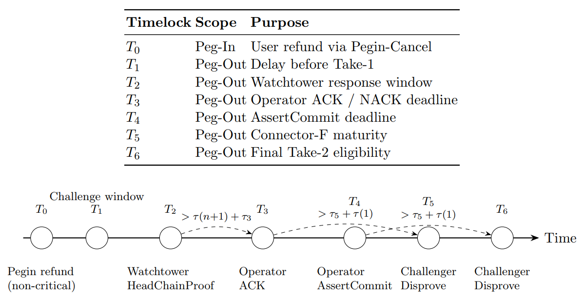 Timelocks and Global Timing Model The protocol relies on Bitcoin timelocks to enforce safetyand dispute resolution.