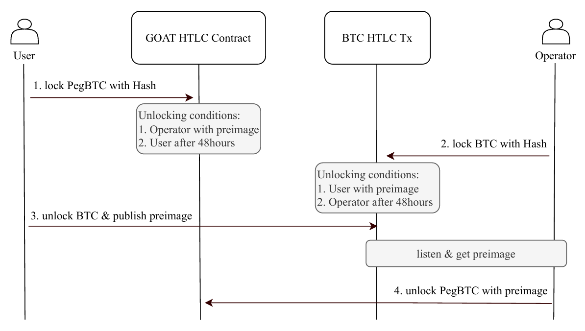 In the original BitVM2 protocol, the operator locks it’s collateral on L1 directly and leverages an experimental opcode OP BLOCKHASH to check its confirmation in the longest chain, but this is not operational. Instead, GOAT BitVM2 requires the operators to lock collateral on L2, and use the Atomic Swap to pay the end-user. In this way, we can simplify the original protocol.