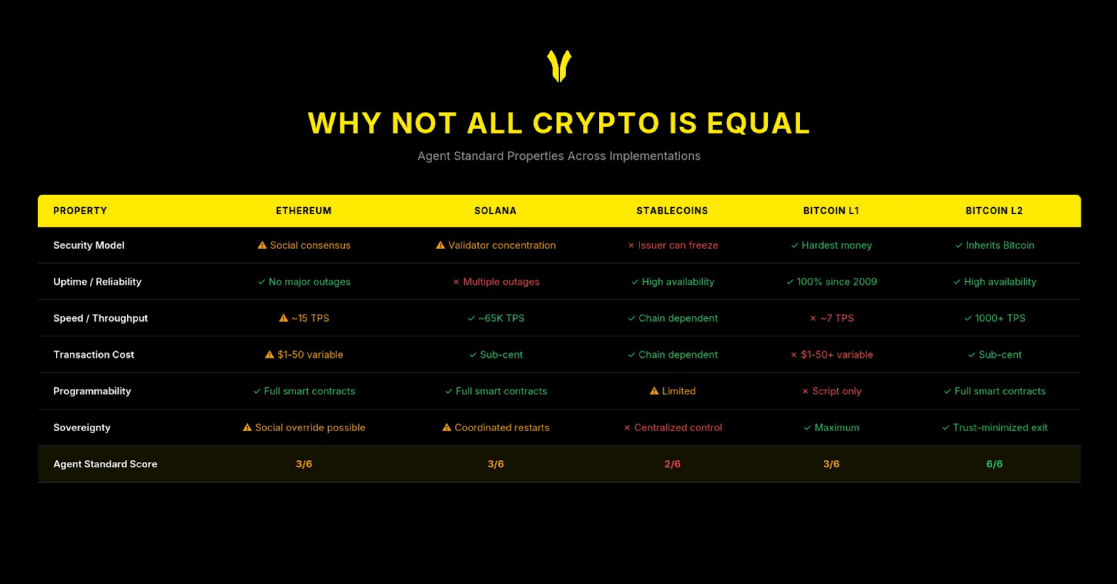 Not all cryptocurrency implementations provide these properties. Ethereum's social consensus introduces uncertainty that agents managing significant value cannot accept. Solana's performance comes at the cost of reliability that agents cannot tolerate. Stablecoins reintroduce centralization and censorship that agents must avoid. Bitcoin layer 1 provides monetary soundness but lacks the programmability and throughput agents require.