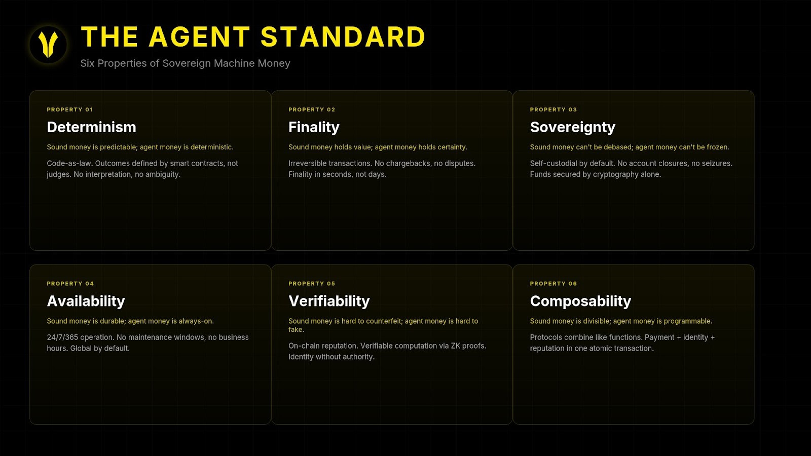 The Agent Standard extends this argument: traditional finance, designed for human participants with legal identities and recourse mechanisms, is fundamentally unsuited to autonomous machines. Agents require money with different properties - determinism over interpretation, finality over reversibility, sovereignty over oversight, availability over business hours, verifiability over trust, and composability over integration friction.