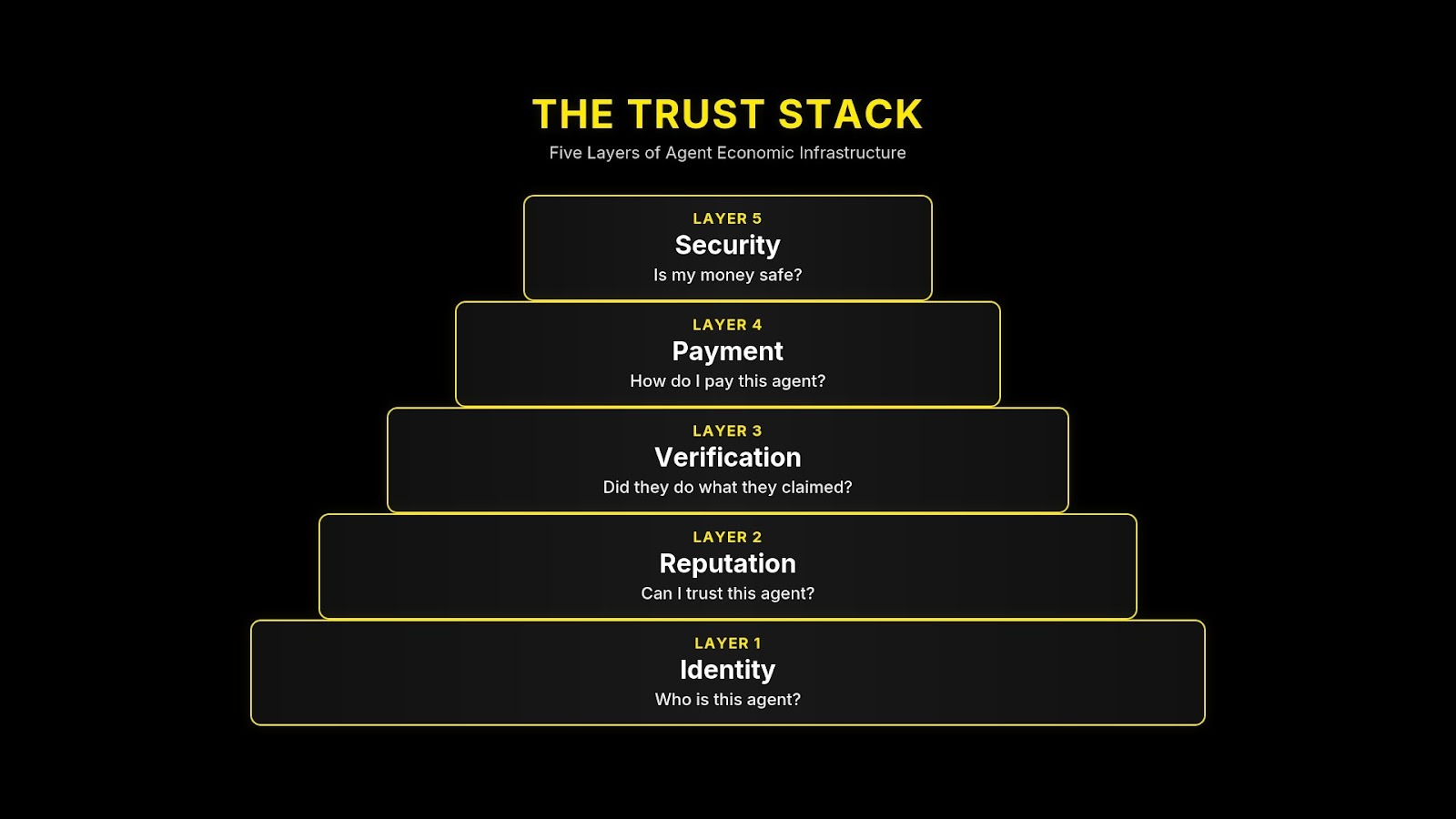 Each layer builds on the previous ones. Identity enables reputation, reputation enables trust, trust enables verification, verification enables payment, and payment requires security. Miss any layer and the stack collapses: anonymous agents cannot build reputation, unreliable agents cannot attract work, unverifiable work cannot command payment, insecure payment rails cannot hold value.