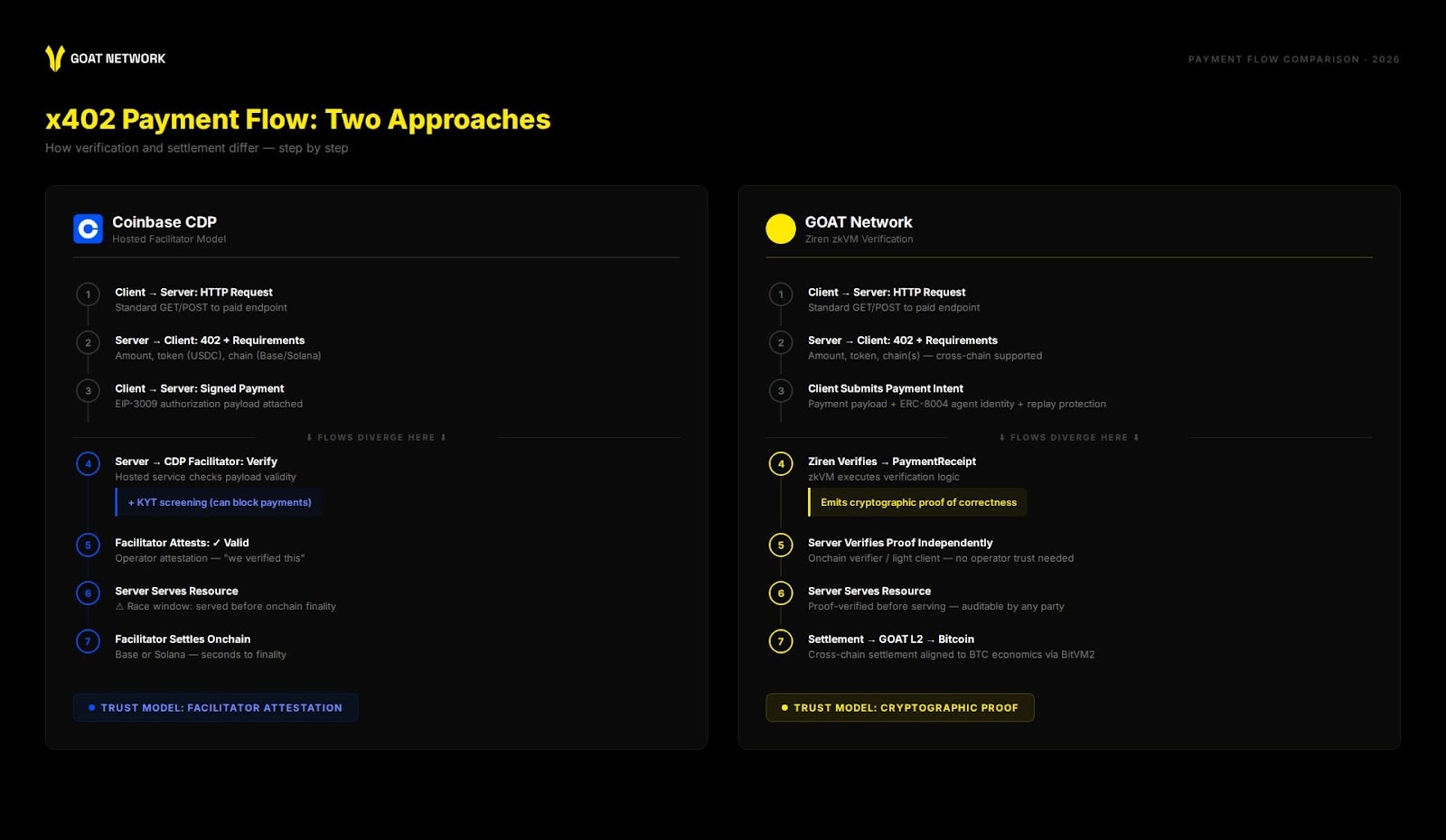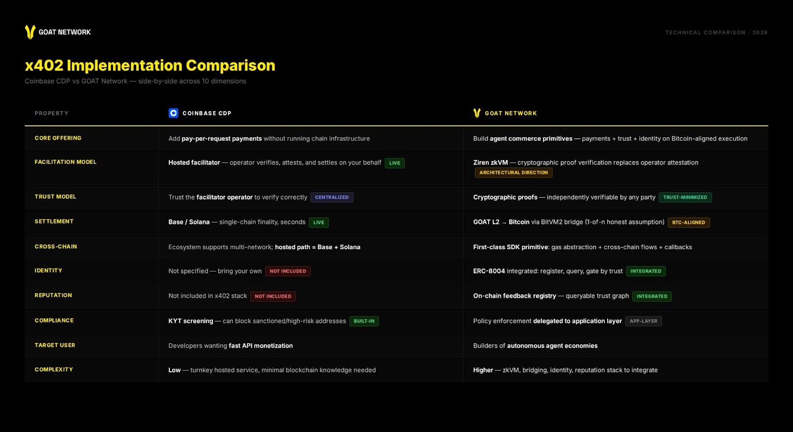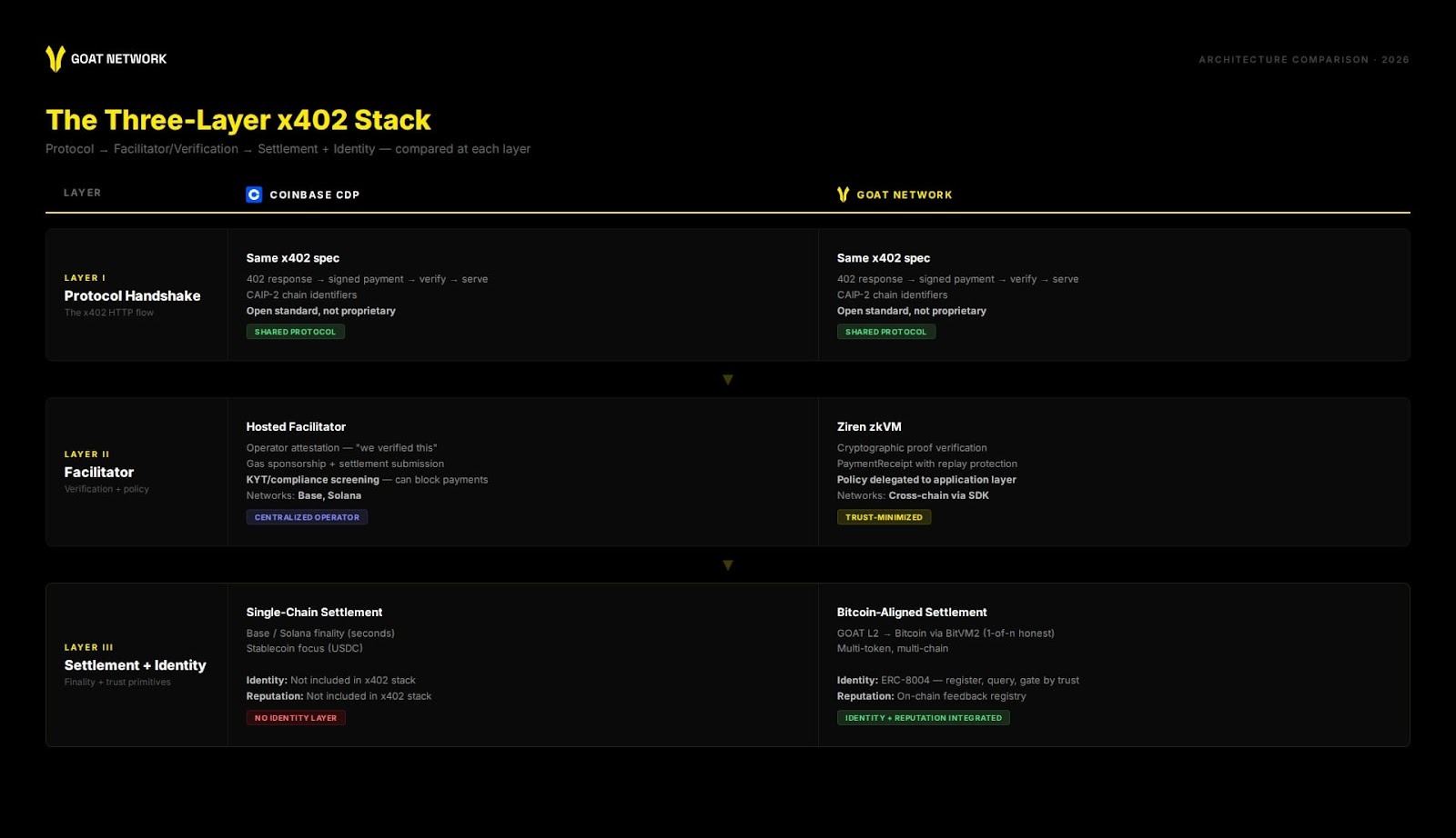 If your priority is agent-to-agent commerce at scale - multi-rail payment orchestration, identity and reputation as a native primitive, Bitcoin-aligned settlement guarantees, and a path from facilitator trust to proof-verified receipts - then GOAT Network is the stack built for that end state.